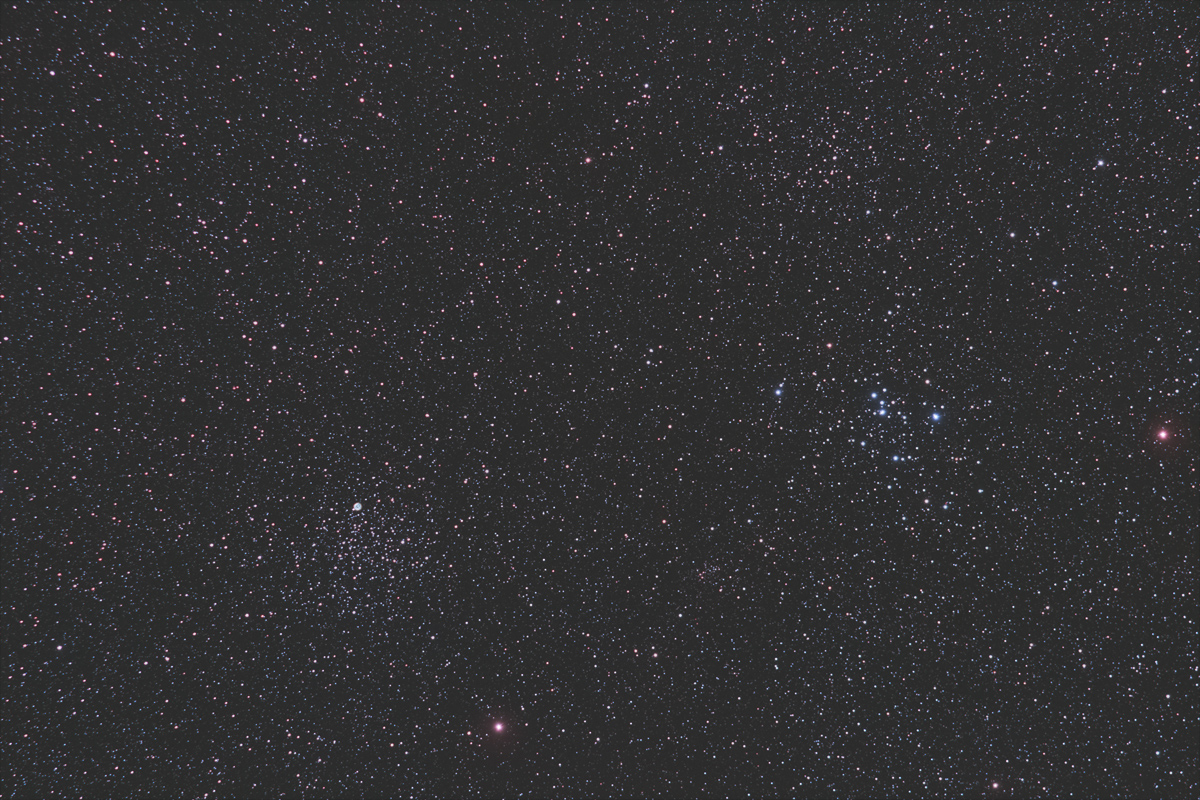M46 et M47, deux amas globulaires ouvert, lunette 80mm William Optics avec Canon 500D défiltré, 15 poses de 4 minutes.
